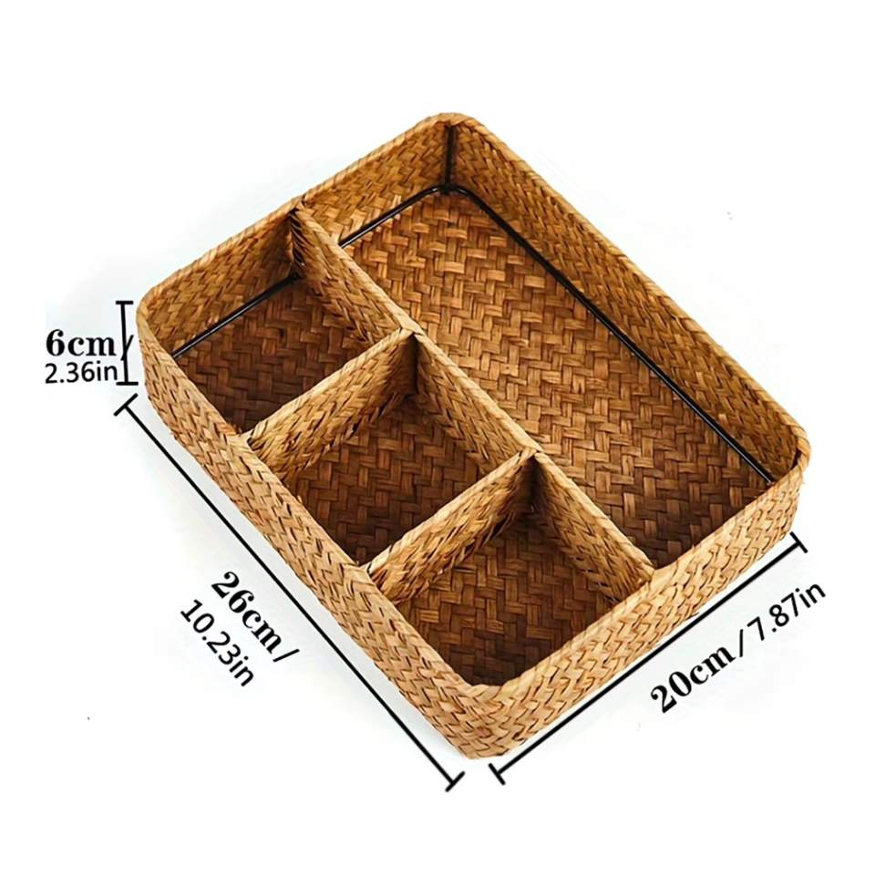 Seu formato retangular com quatro compartimentos espaçosos permite organizar diferentes itens do dia a dia, como lanches, maquiagem, joias, papéis, cosméticos e até utensílios de escritório. Feita à mão com ervas marinhas trançadas, a cesta é resistente, durável e ainda traz uma estética aconchegante que valoriza a decoração de qualquer espaço.
