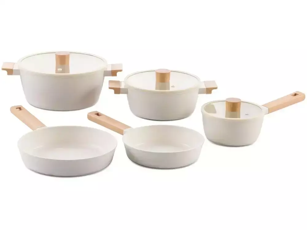 Jogo de Panelas Creme com Revestimento Cerâmico e Cabos de Madeira – 5 Peças de Elegância e Praticidade!!!